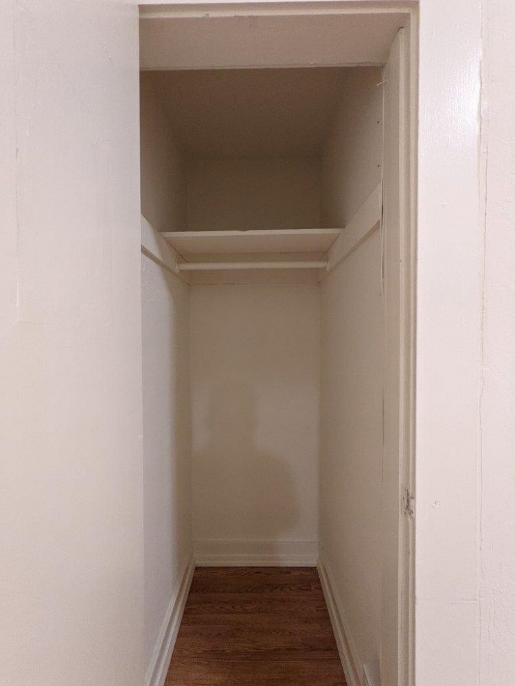 This unit features laminate floors and a galley kitchen with fridge, microwave hood, and electric range included. Bathroom was previously updated with a walk-in shower with stone surround and newer fixtures. Note – this unit’s windows face an internal airwell.