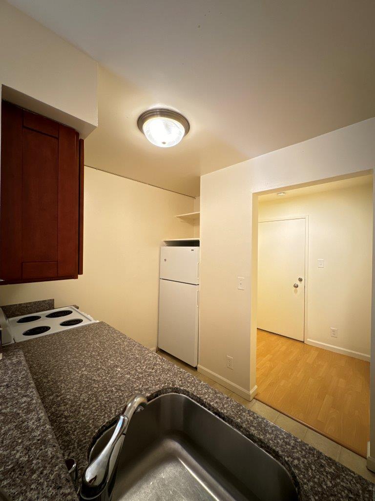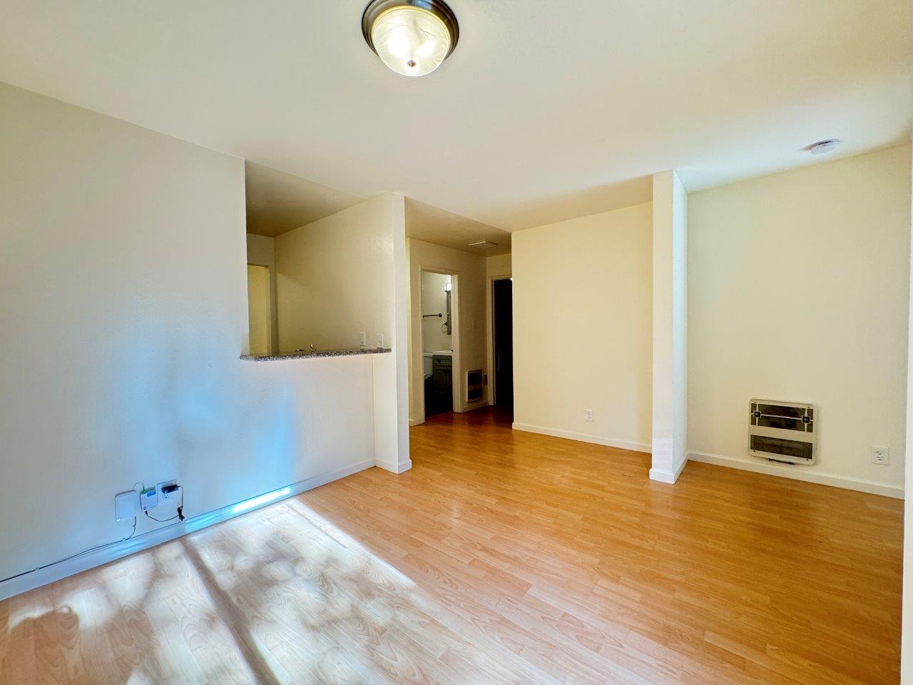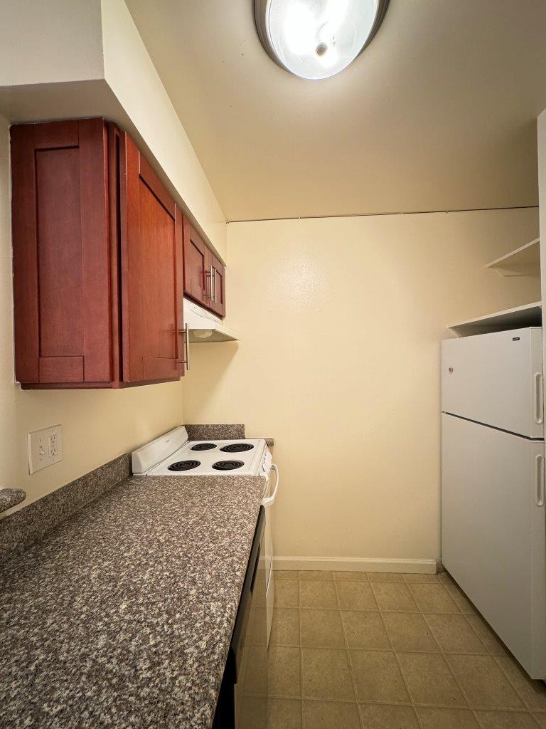 Located on the NW corner of the building this unit is located towards the rear of the property and has nice daytime light and less traffic noise. Kitchen was previously renovated and features cherry cabinets with granite countertops plus included appliances (fridge + electric range). Small breakfast bar opens out to a cozy living room area.