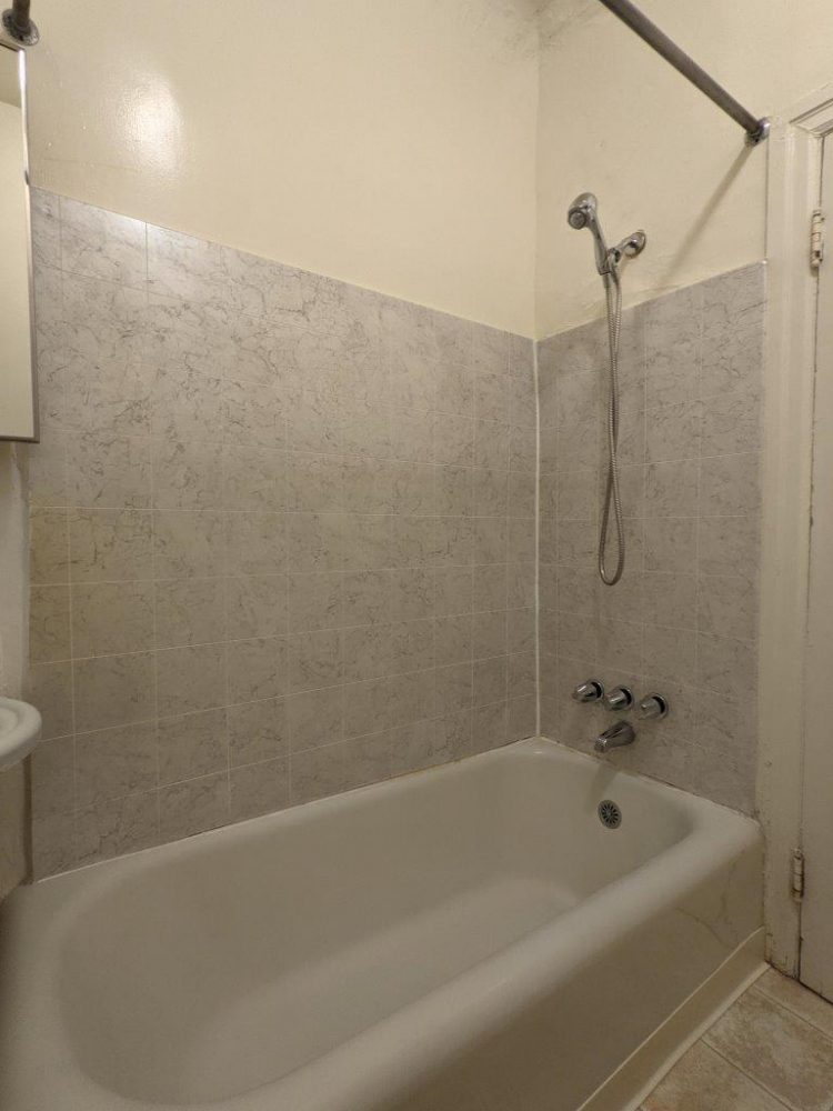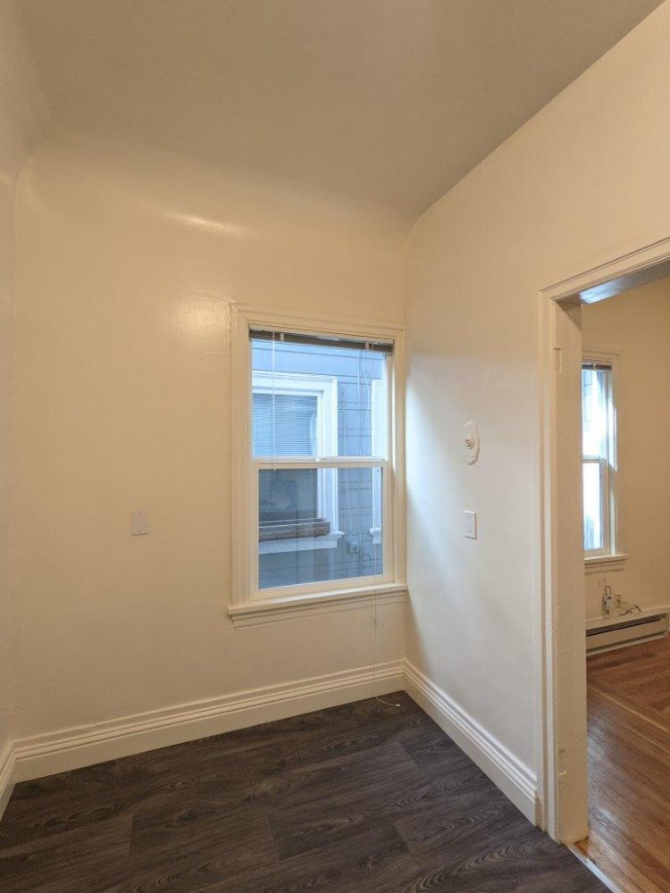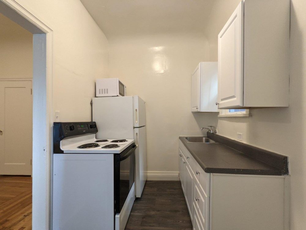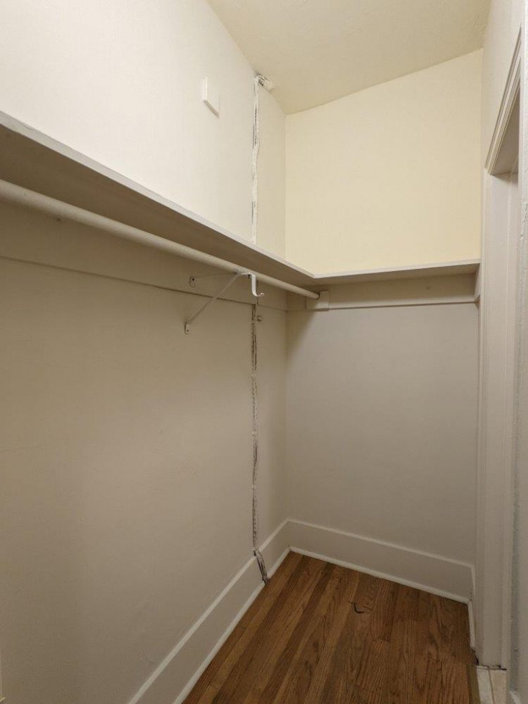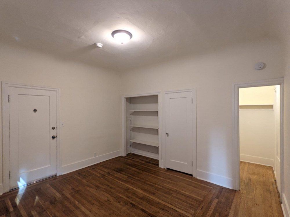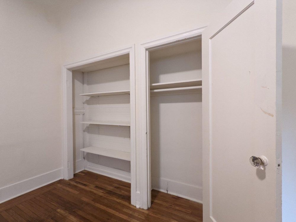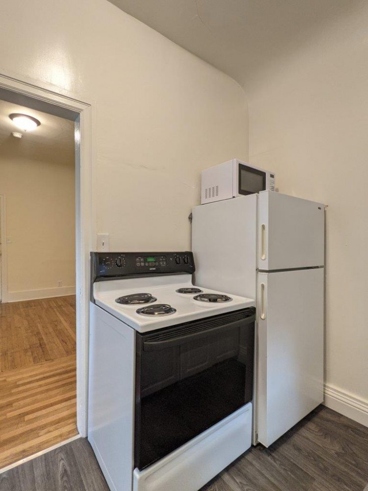 This first floor unit (not ground floor or ADA accessible due to steps) has tall ceilings and original hardwood floors.  Main kitchen area is fully separated from the main living space and has appliances included (fridge + electric stove /oven).  Main living space features plenty of storage space with a nice sized closet, built-in shelves, and full sized walk-in closet.