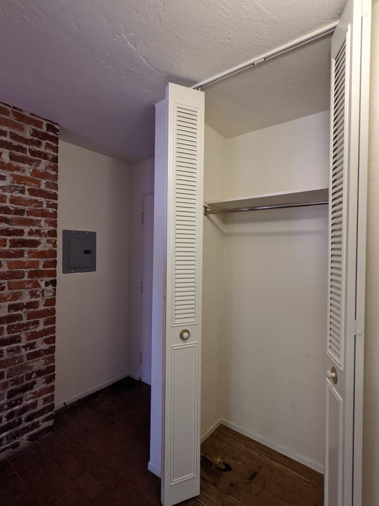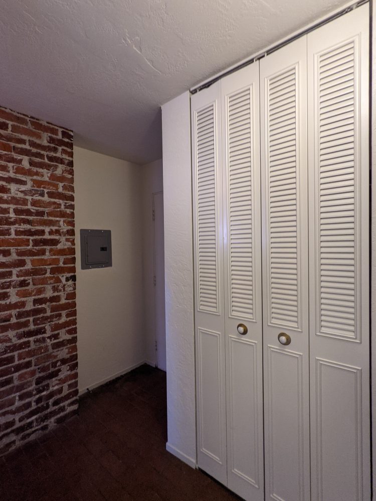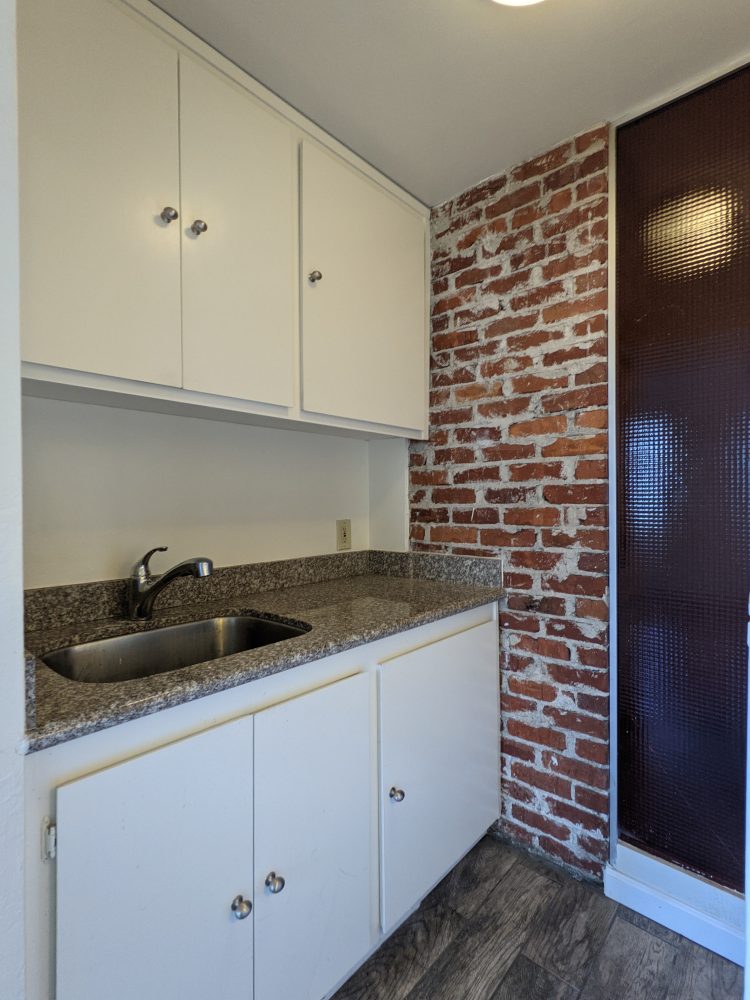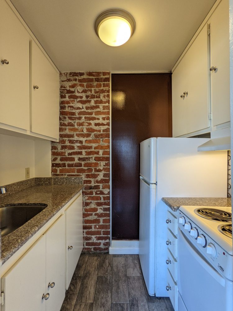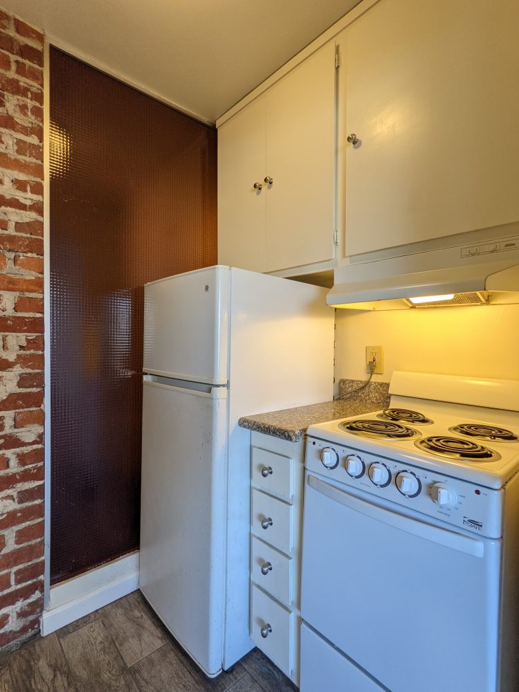 Unit #10 has a nice open living room with hardwood + brick floors. Large windows let in lots of daytime light and air. Cozy kitchen is fully functional with ample cabinet space and features granite countertops and included appliances. Bedroom is separated from main living area and has its own dedicated closet.