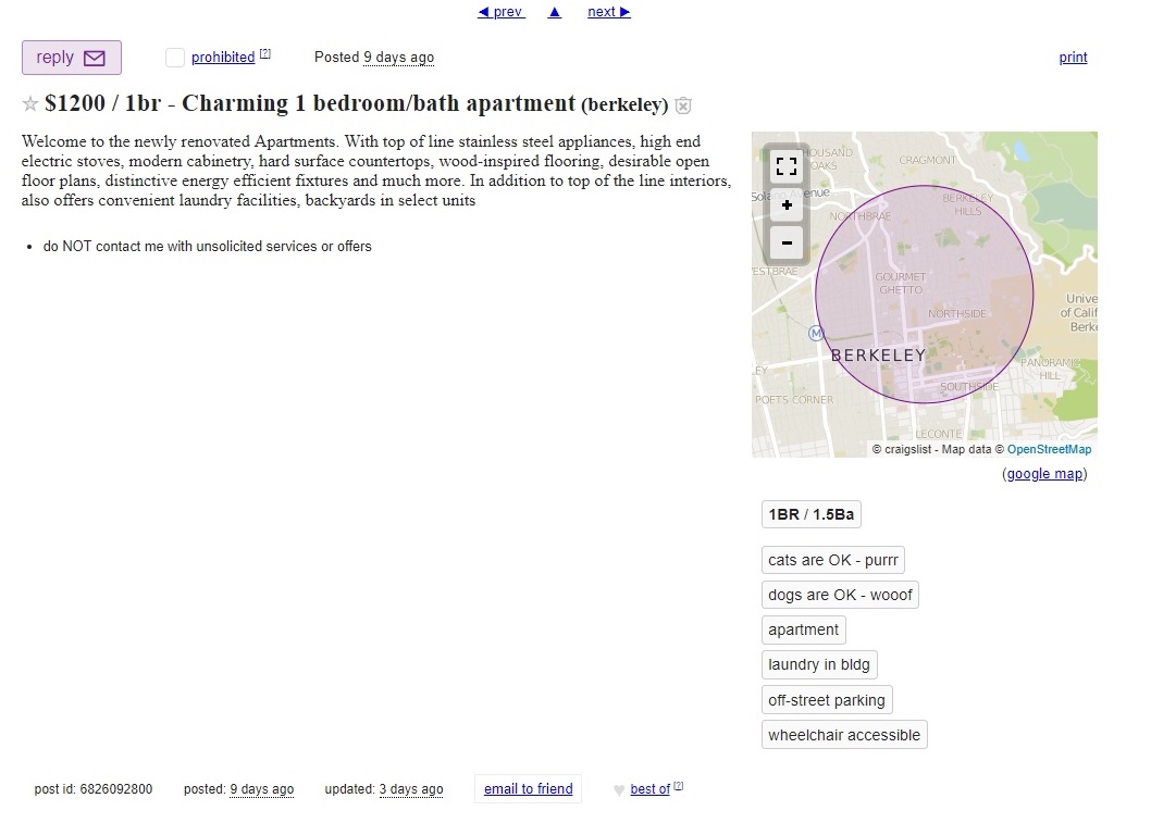Scammers may also ask you to pay a small $50 – $250 fee just to see the unit. Viewing a unit should not cost you anything in Berkeley. Most property managers / owners will conduct public open houses or private showings for FREE.