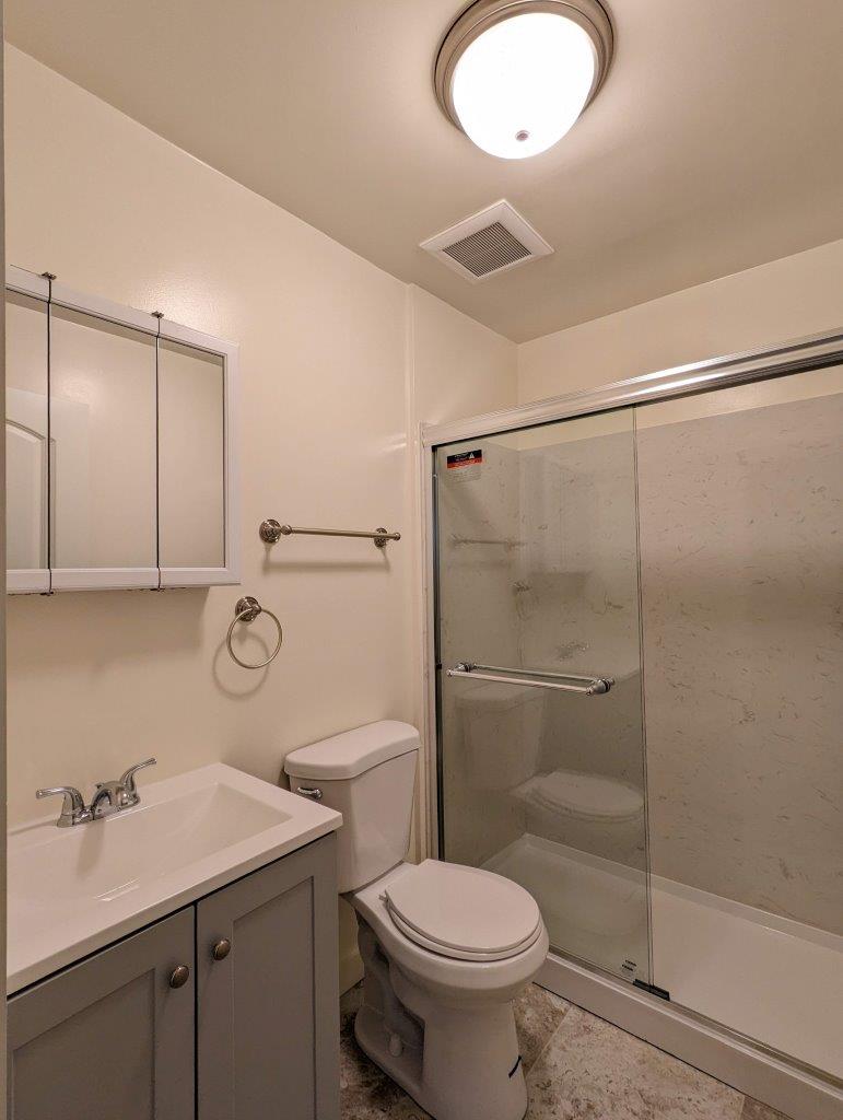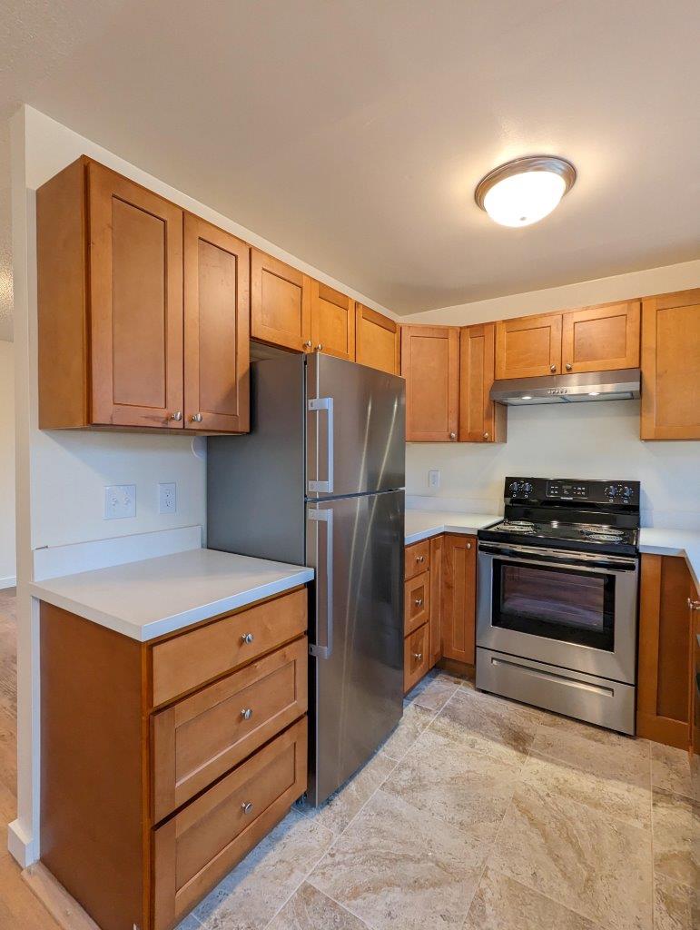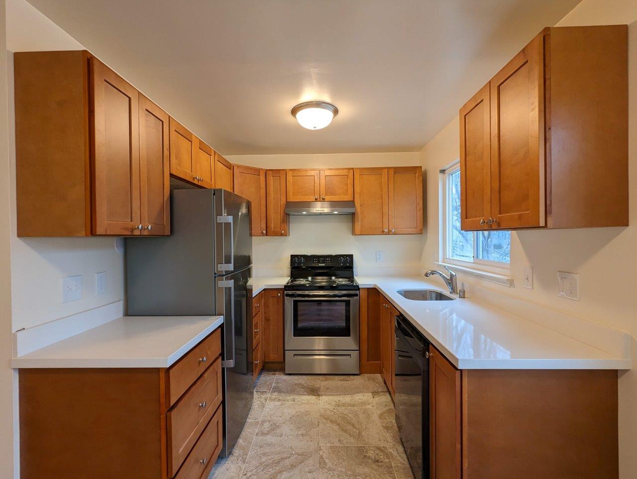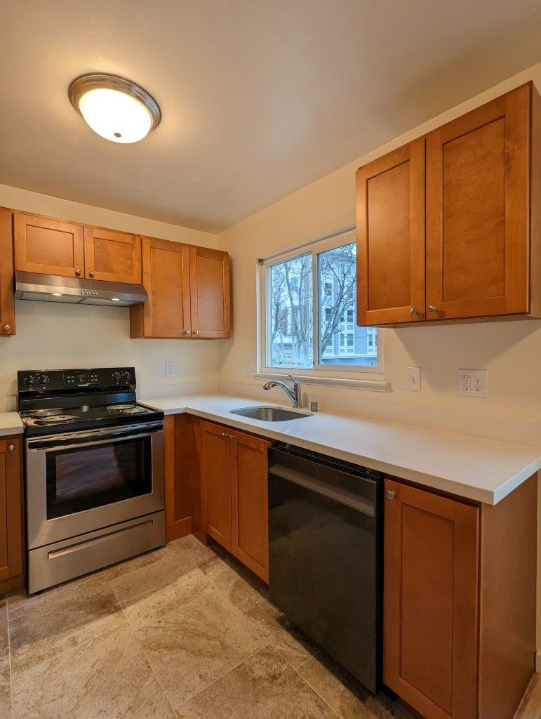 Kitchen was completely renovated with quartz countertops, shaker cabinets, and new appliances installed during a past renovation (fridge/freezer, electric range, and dishwasher). 1550 Oxford also features it’s own in-unit washer/dryer.