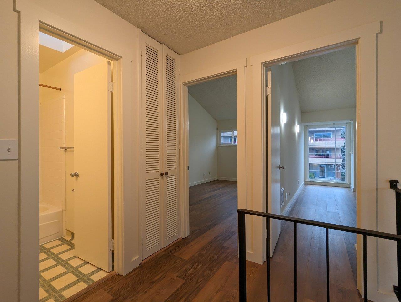This unique 3-bedroom / 2-bathroom unit features a split-level floorplan with an open living room + kitchen and one bedroom plus full bathroom. Two additional bedrooms and a full bathroom are located on the second, upper level of the unit.