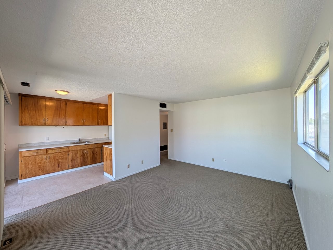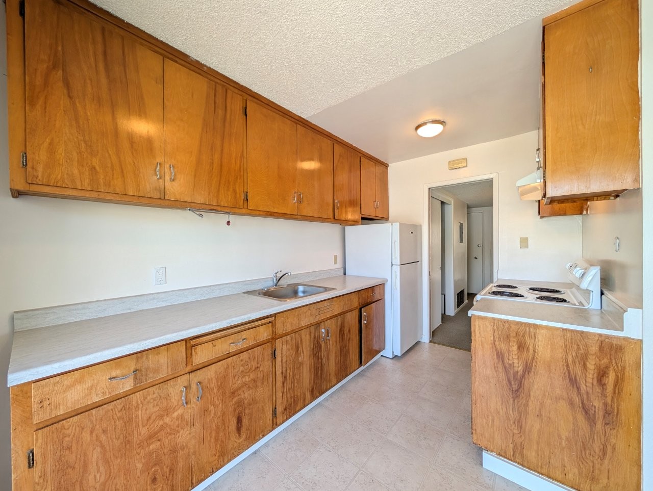 The living room accommodates a full-sized sofa and a dining area, making it suitable for both relaxation and entertaining. The kitchen, while compact, offers essential amenities for daily cooking needs. The bathroom features a standard layout with a shower/tub combination, sink, and toilet.