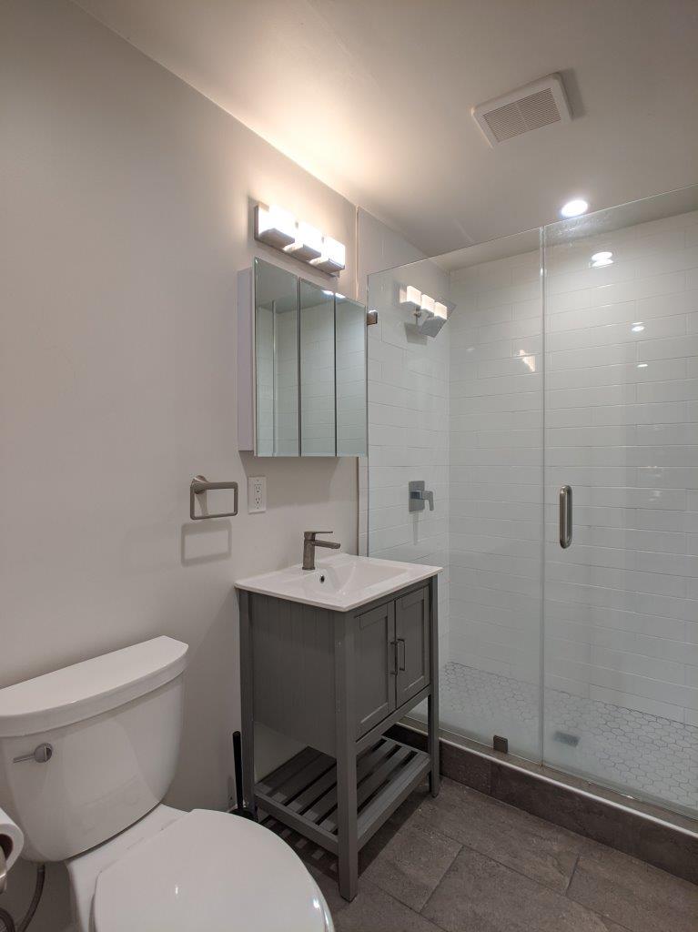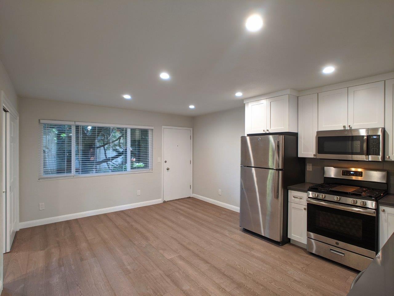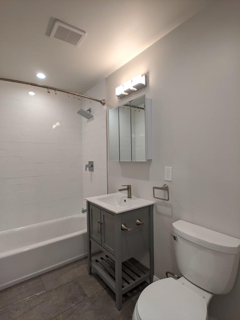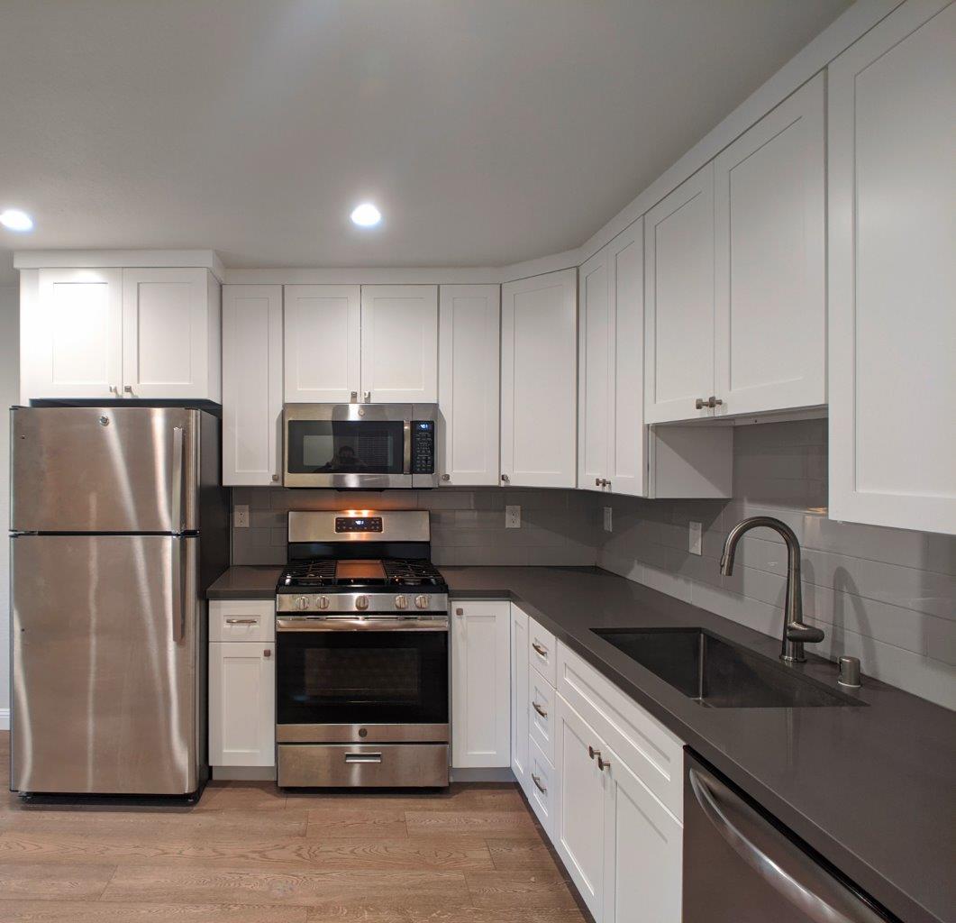 The new living room / kitchen area features an open concept layout that features a roomy living area complete with a fully renovated kitchen. New slate quartz countertops with white shaker cabinets compliment the modern feel of the unit. Stainless steel appliances – fridge/freezer, gas range, microwave hood, and dishwasher all come with the unit.