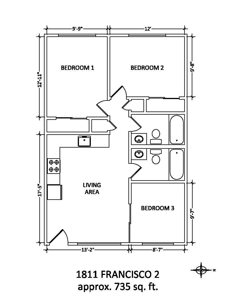3-Bedroom / 2-Bath, 735 sq feet