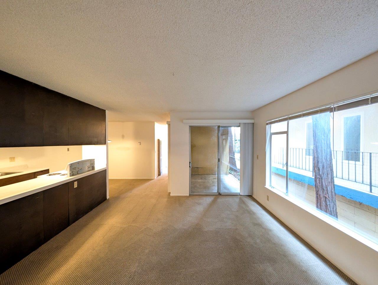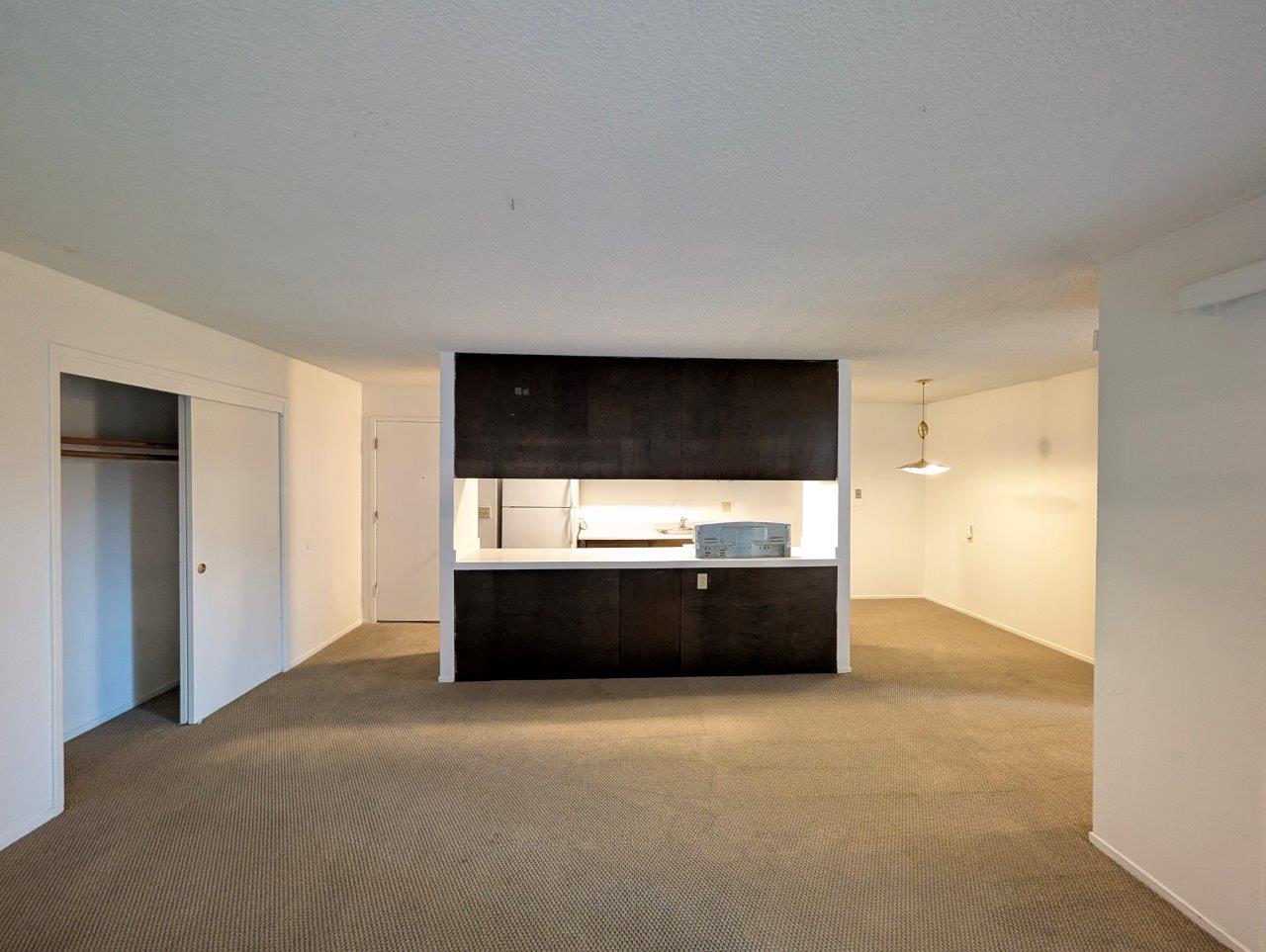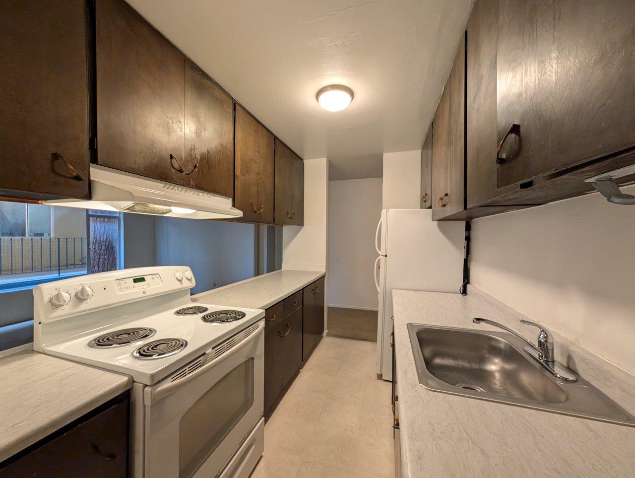Open-concept living area offers a generous floor space and leads out to a private covered balcony area. The kitchen, while compact, is functional with dark wood cabinetry contrasting against white countertops and appliances. It opens to the living area, promoting a sense of spaciousness and facilitating easy entertaining.