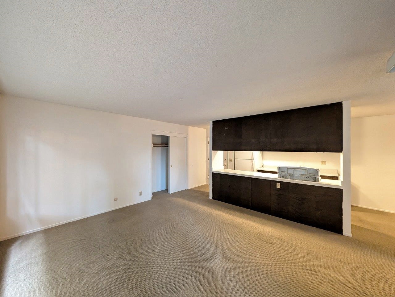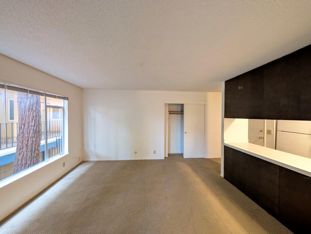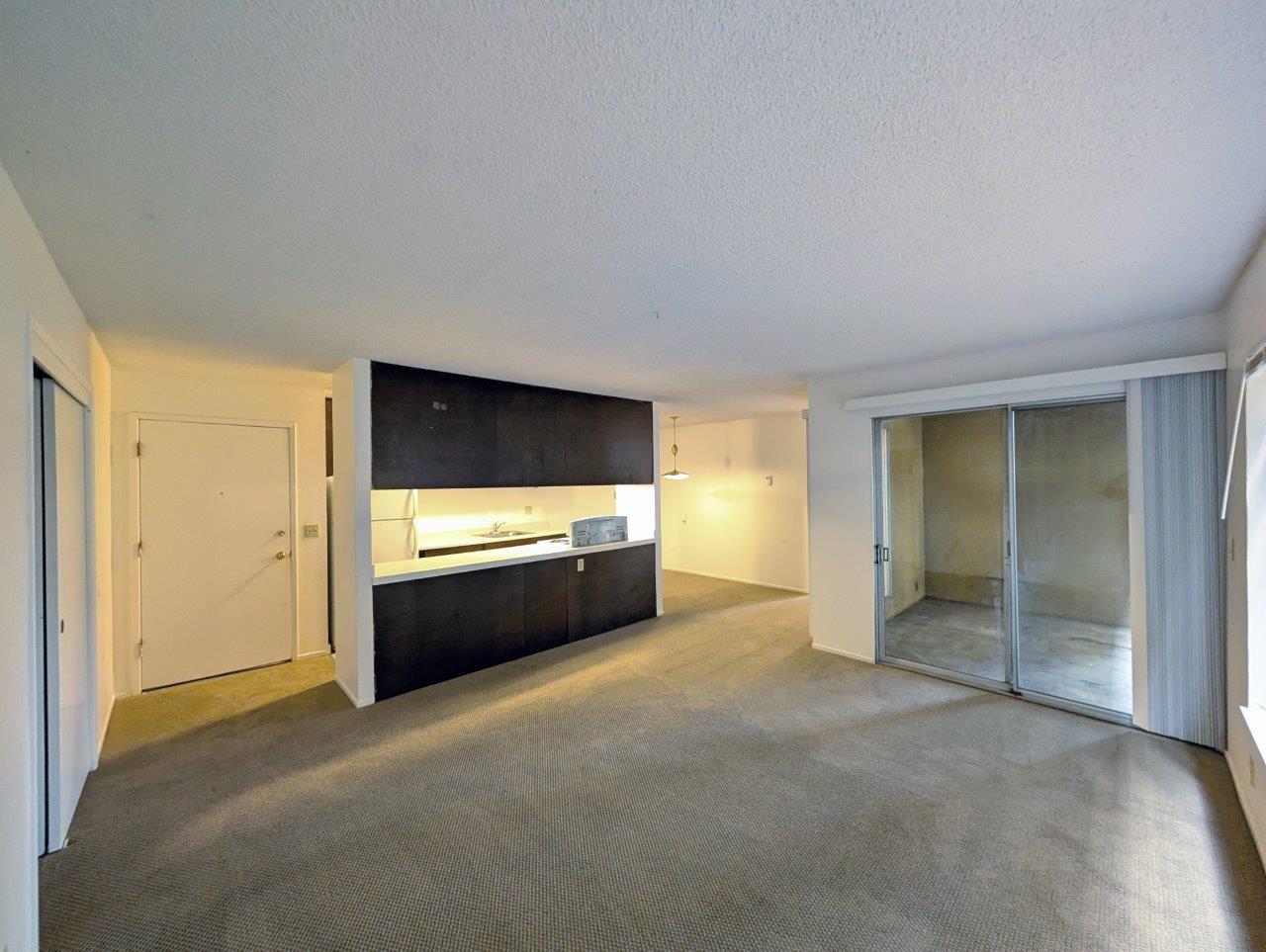 Open-concept living area offers a generous floor space and leads out to a private covered balcony area. The kitchen, while compact, is functional with dark wood cabinetry contrasting against white countertops and appliances. It opens to the living area, promoting a sense of spaciousness and facilitating easy entertaining.