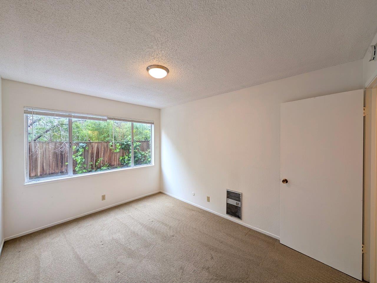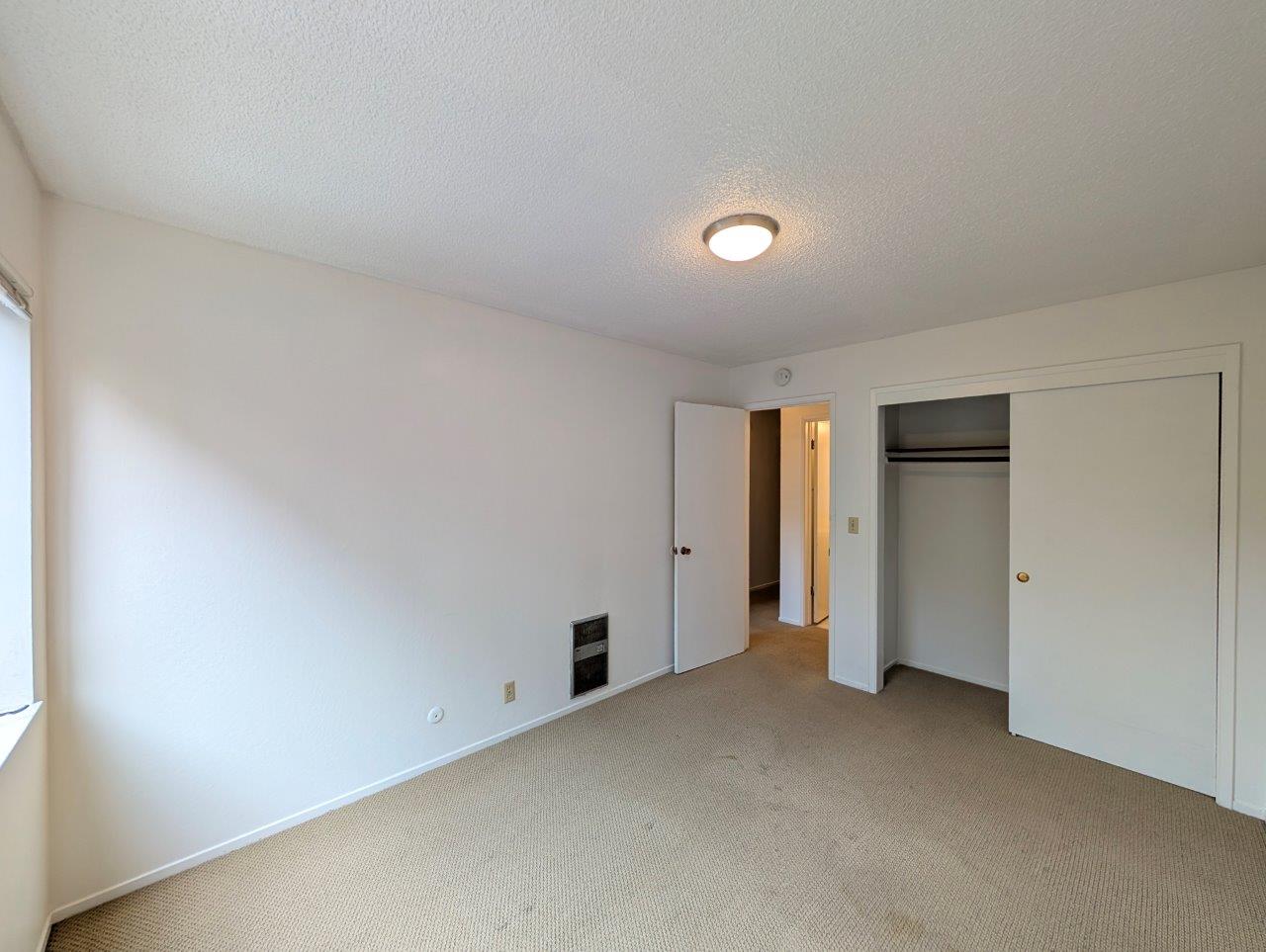Both bedrooms feature large windows, providing natural light and views of the outdoors. Built-in wall heaters in the bedrooms offer individual climate control. The bathroom, though modest, is efficiently designed with a combined tub and shower unit, and crisp white fixtures.