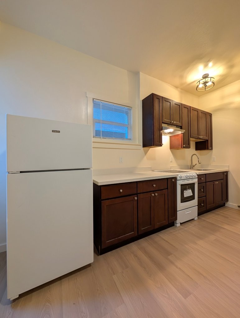 This unit features laminate floors and a full galley kitchen with fridge, hood, and electric range included. Bathroom was recently updated with a walk-in shower with cultured marble surround and new fixtures.