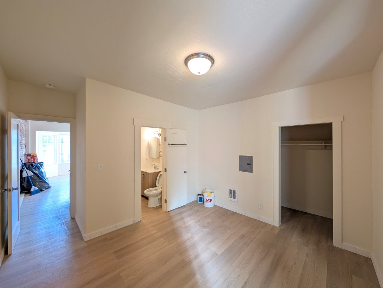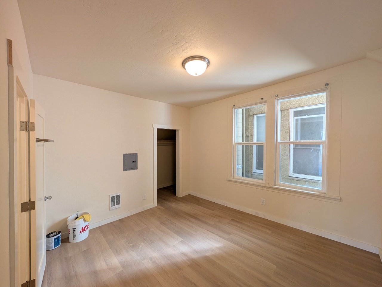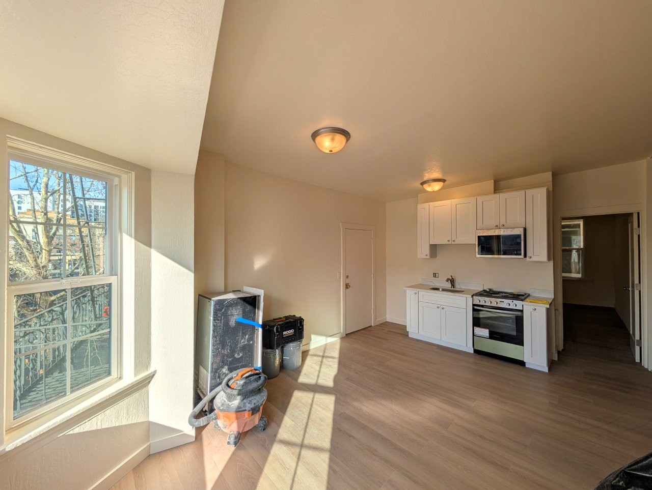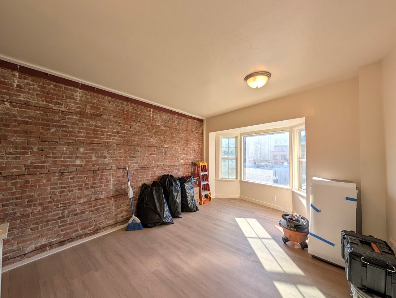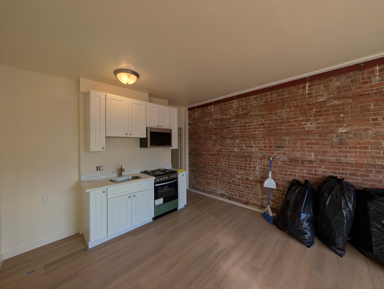 This third floor unit features a nice sized bedroom area with laminate floors, and remodeled bathroom plus galley-style kitchen. Kitchen was redone with granite countertops, wood cabinets, and updated appliances (fridge / freezer, and electric stove all come included). Bathroom features a walk-in shower with marble surround and updated fixtures / vanity.