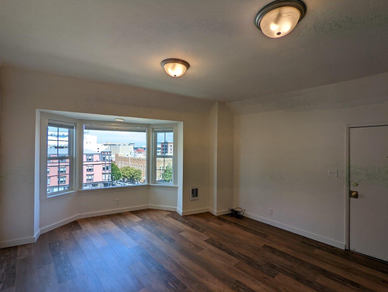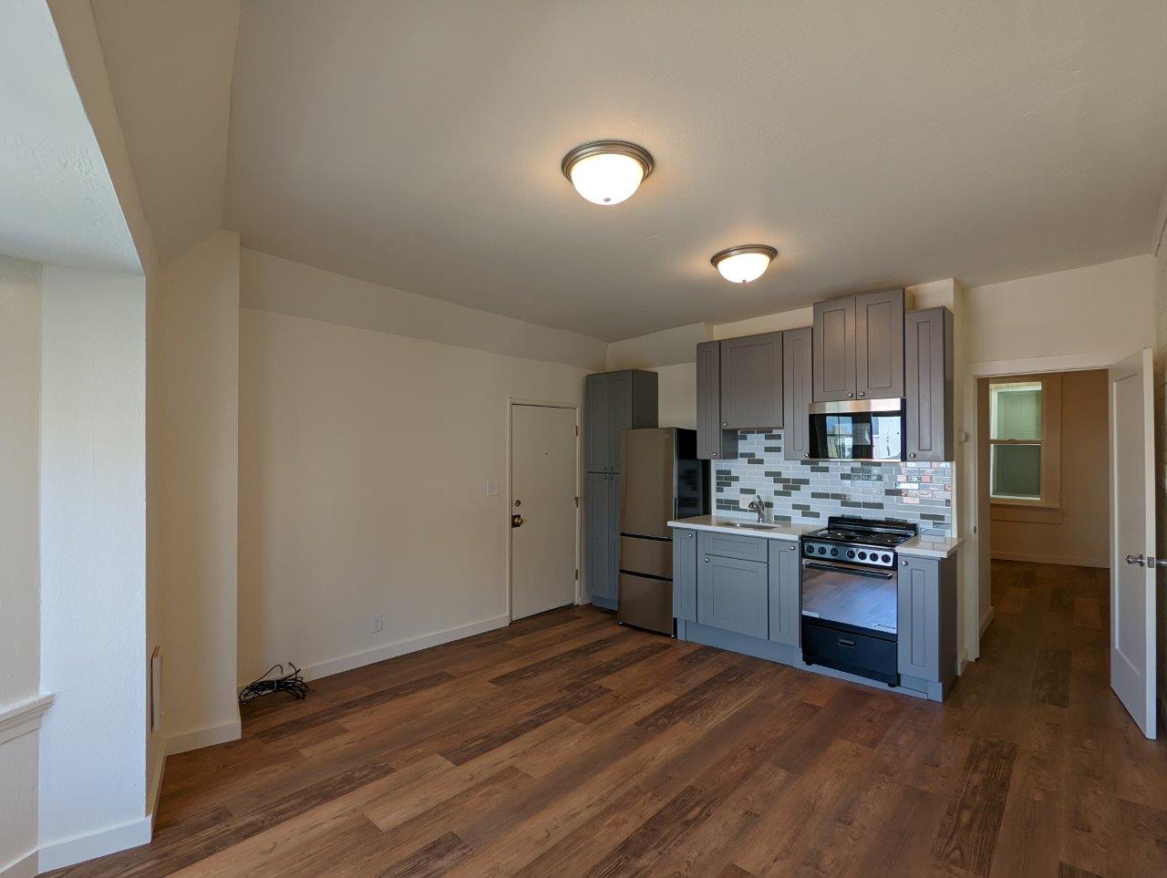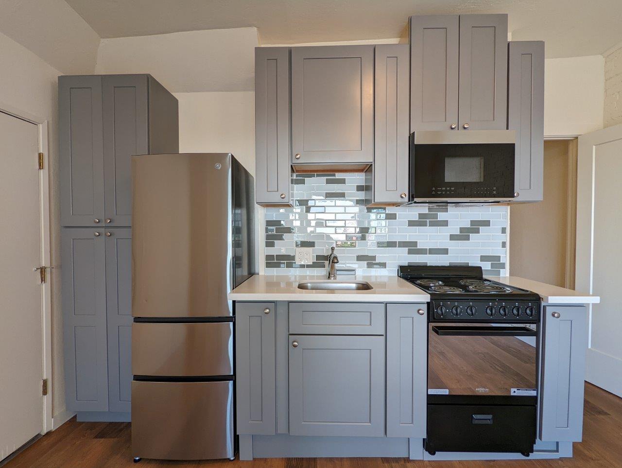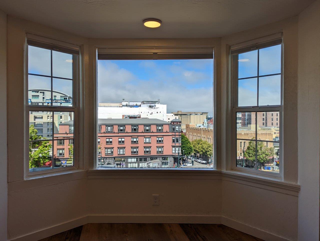 This top floor unit has a large open living room with a bay window with a gorgeous view of the Downtown Berkeley skyline.Β Galley kitchen was previously renovated and includes stainless steel appliances (microwave, electric range / oven, fridge/freezer) and shaker cabinets.
