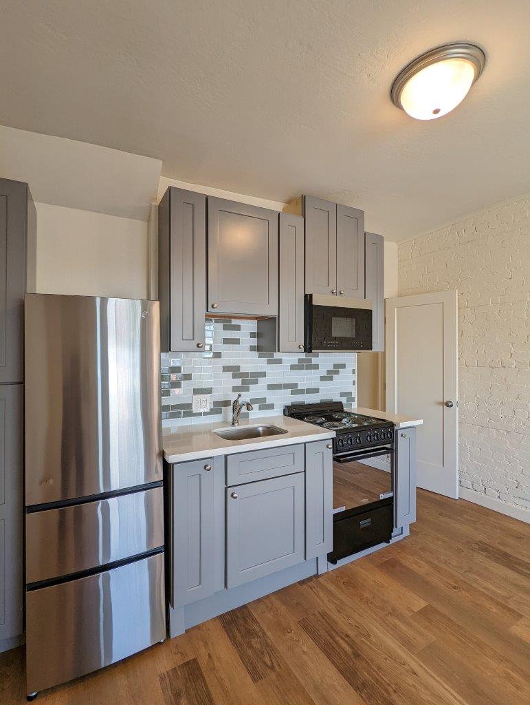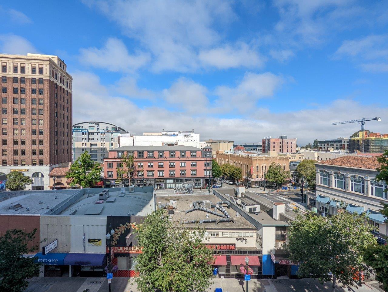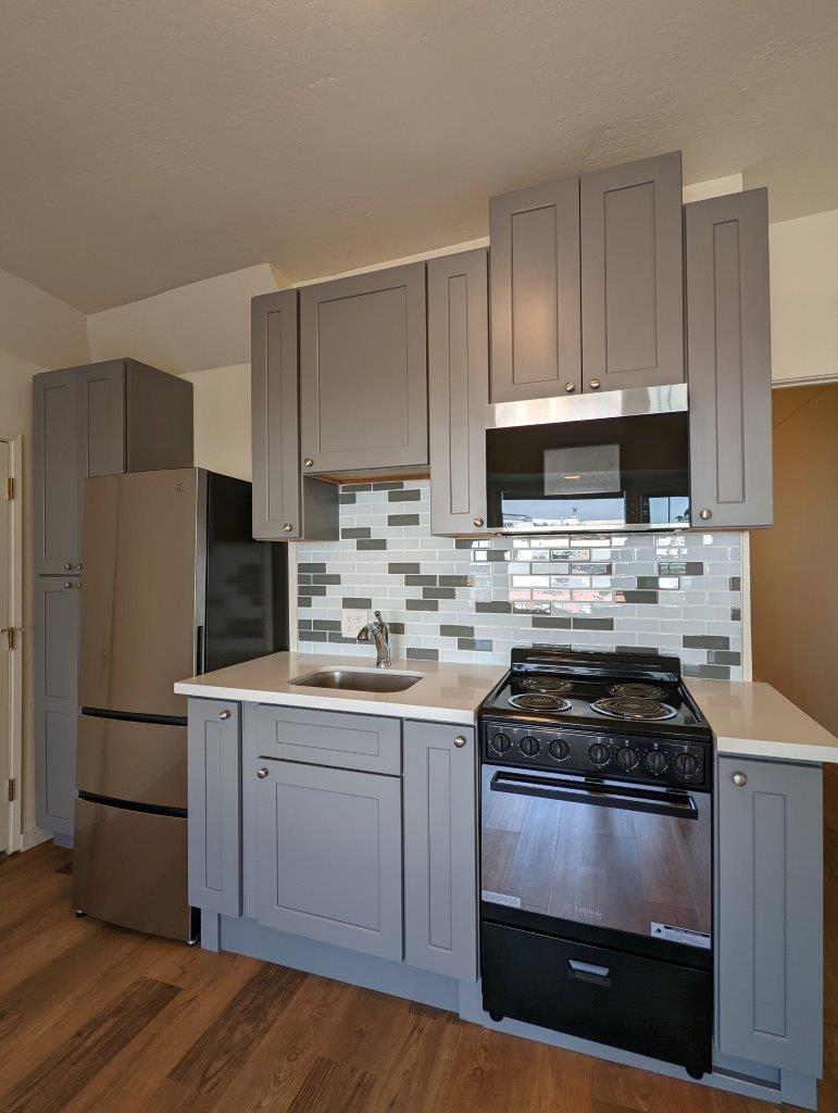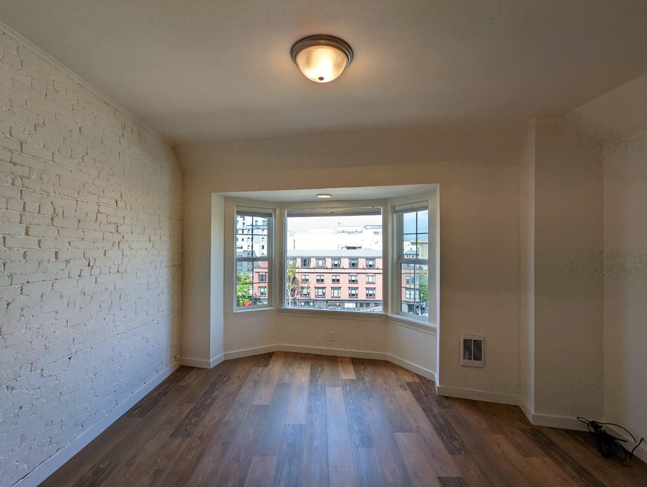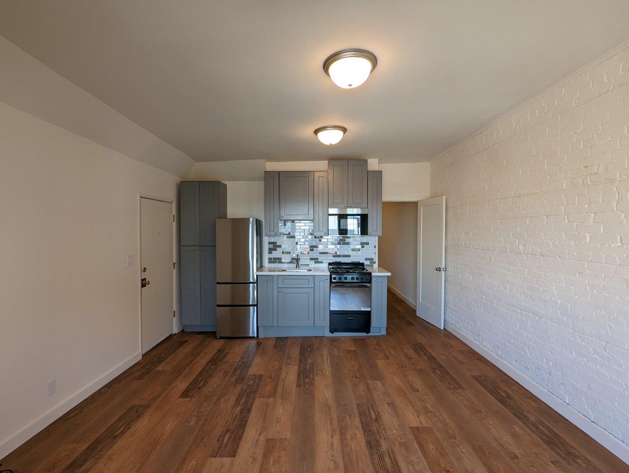 This top floor unit has a large open living room with a bay window with a gorgeous view of the Downtown Berkeley skyline.Β Galley kitchen was previously renovated and includes stainless steel appliances (microwave, electric range / oven, fridge/freezer) and shaker cabinets.