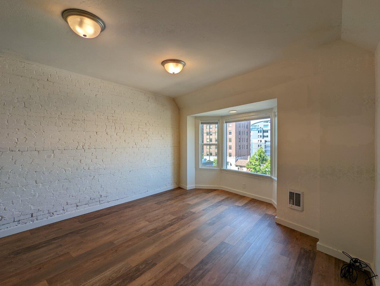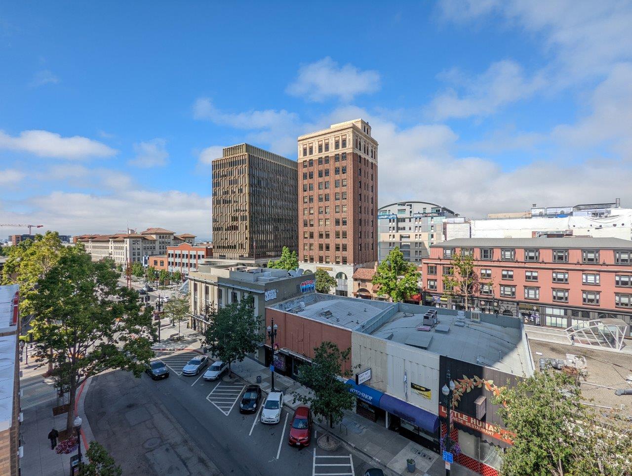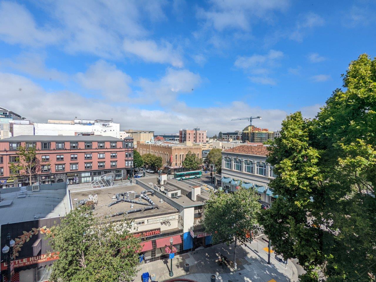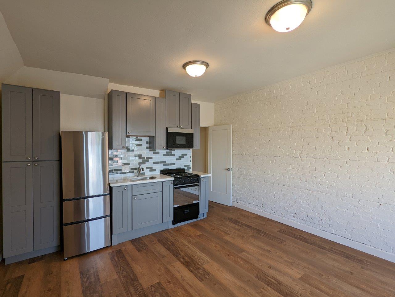 This top floor unit has a large open living room with a bay window with a gorgeous view of the Downtown Berkeley skyline.Β Galley kitchen was previously renovated and includes stainless steel appliances (microwave, electric range / oven, fridge/freezer) and shaker cabinets.