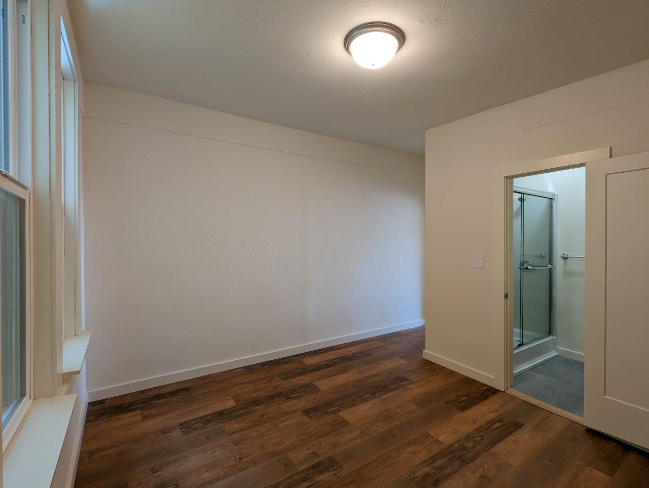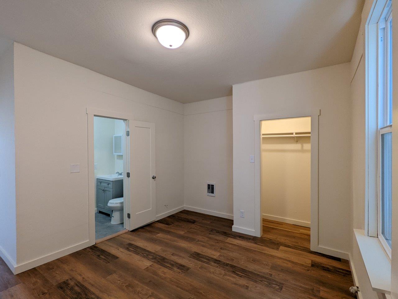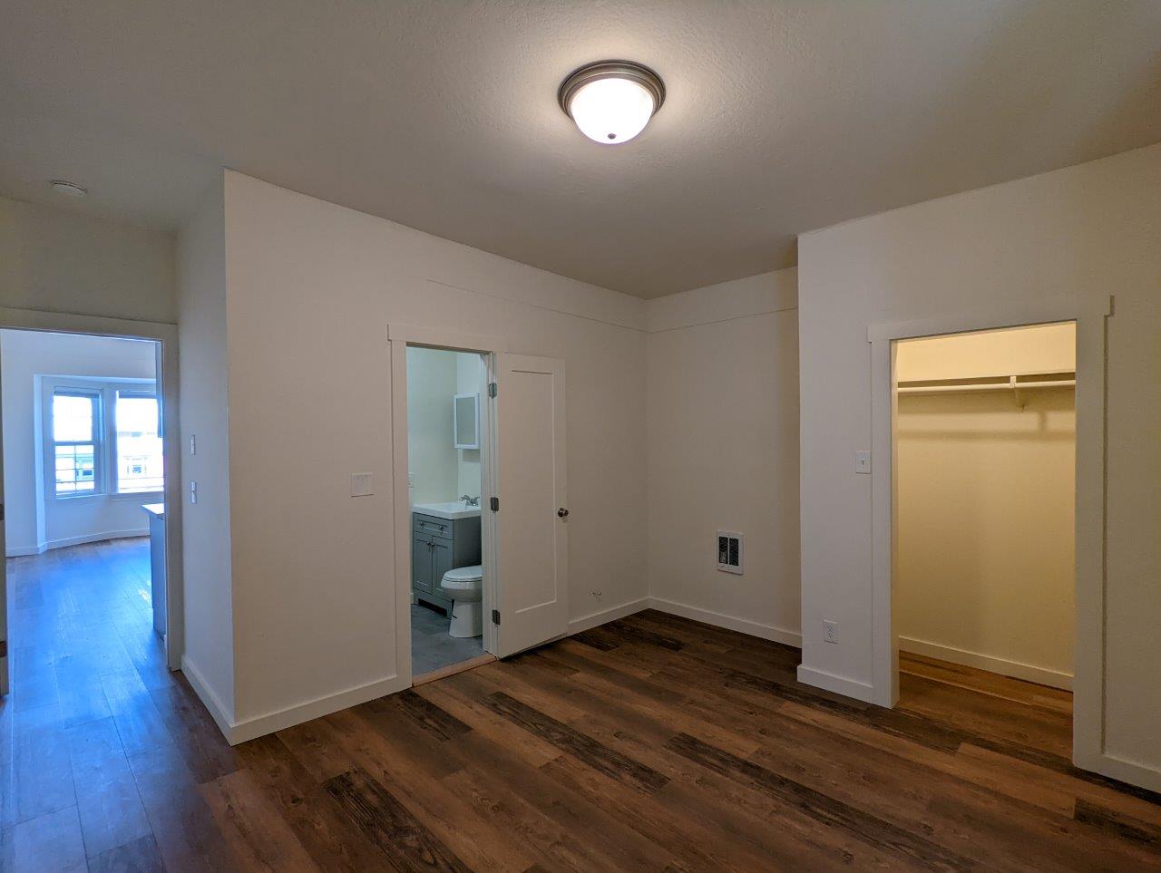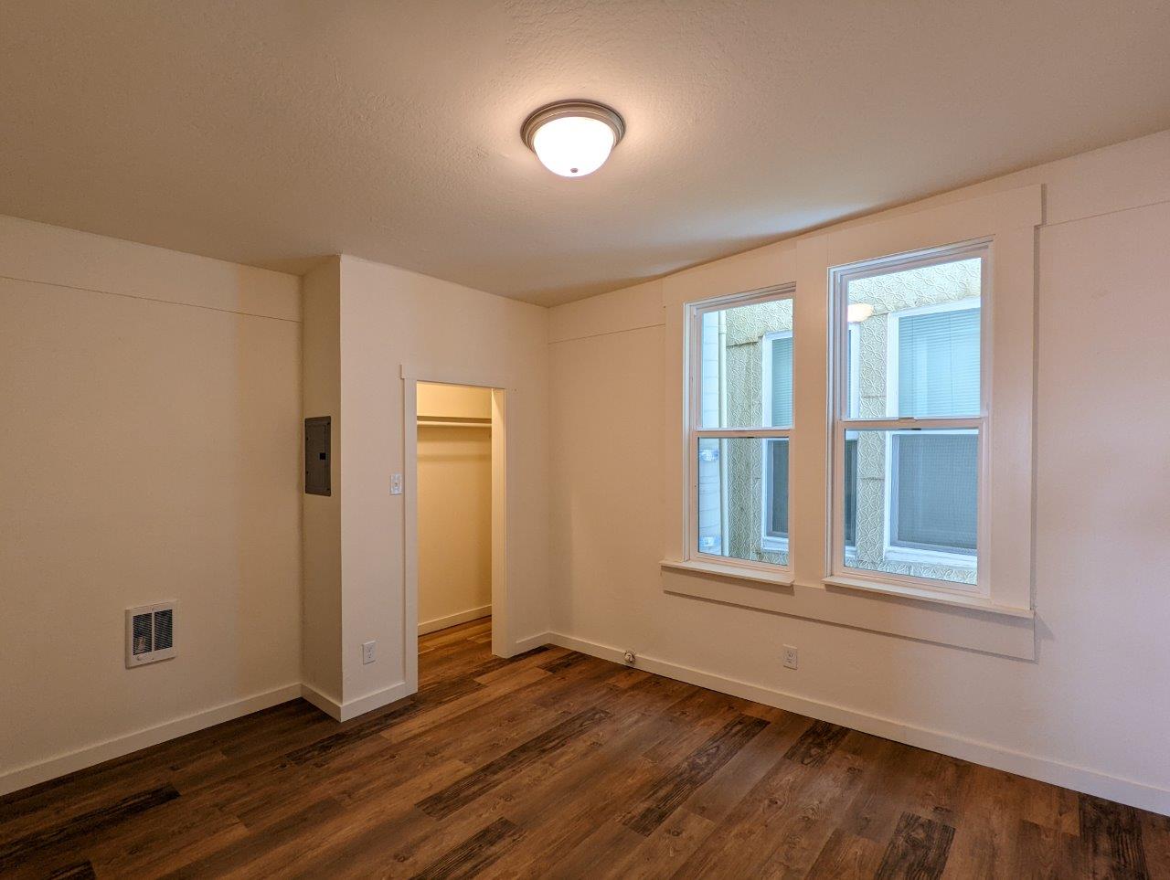 Bedroom is located off the main living space and faces away from the street so it is more private with less street noise.Β A small walk-in closet provides ample storage space.Β Bathroom was also renovated with newer fixtures and walk-in shower.