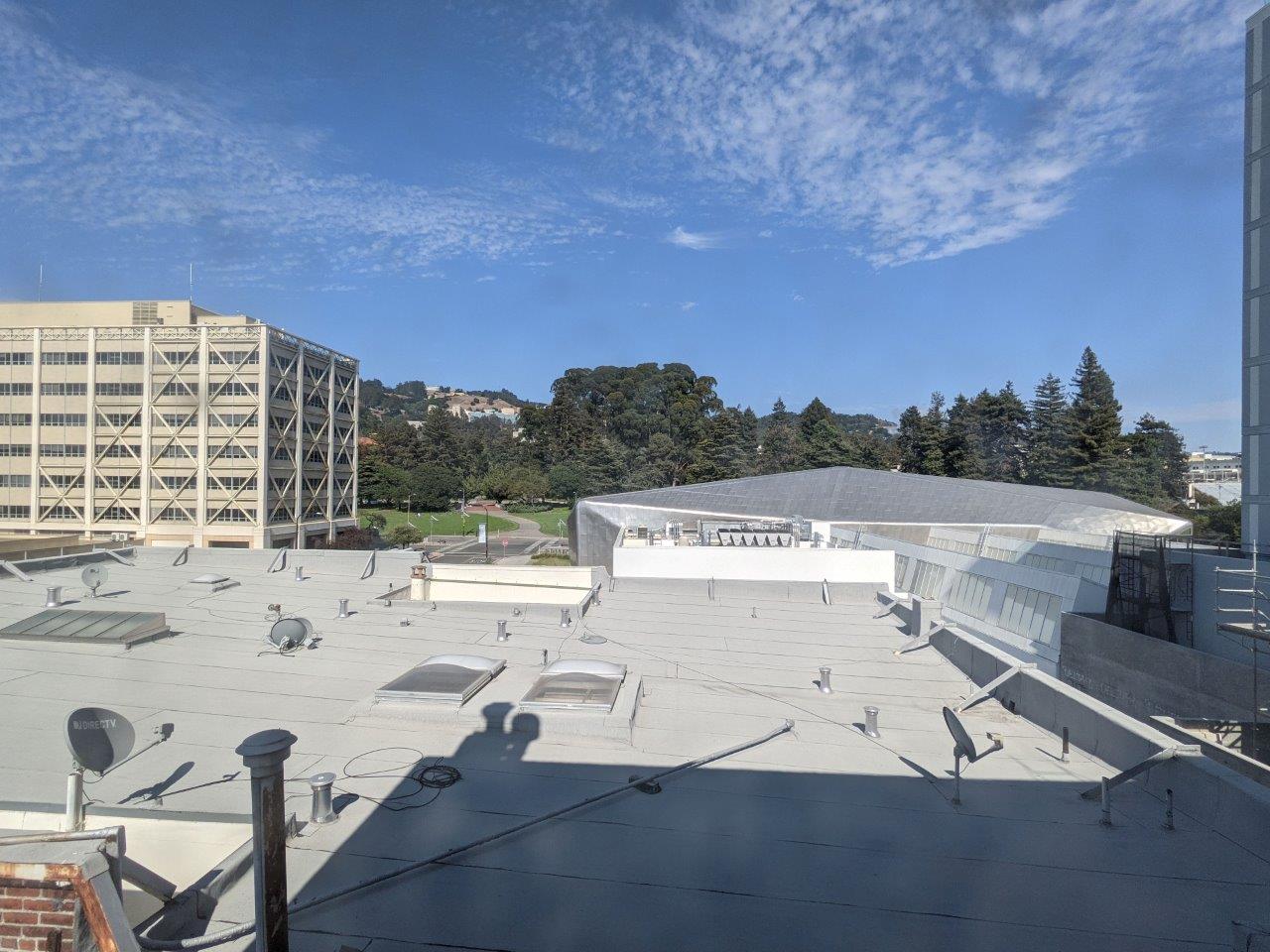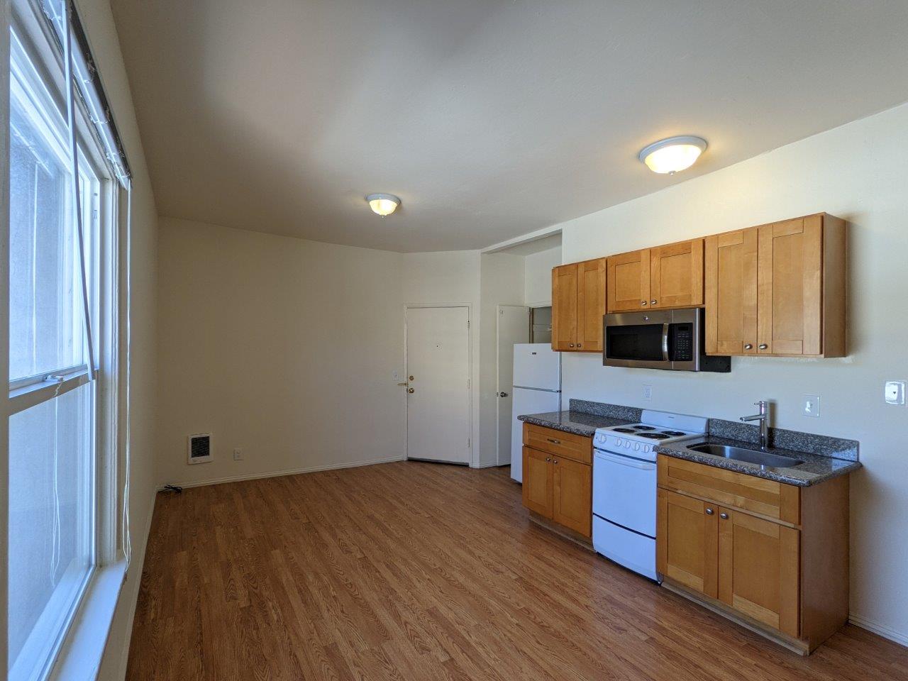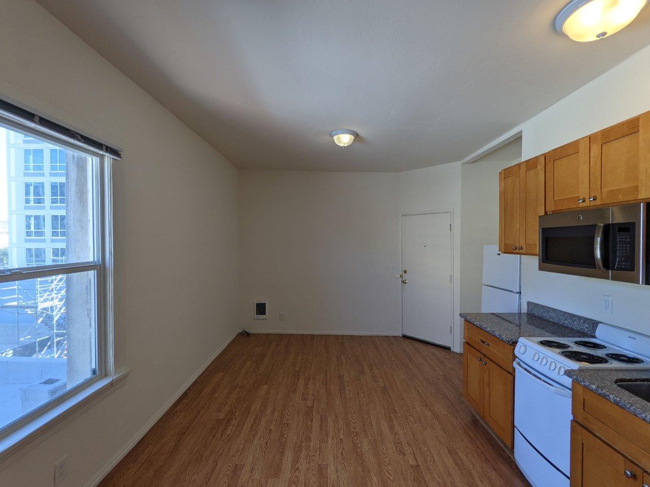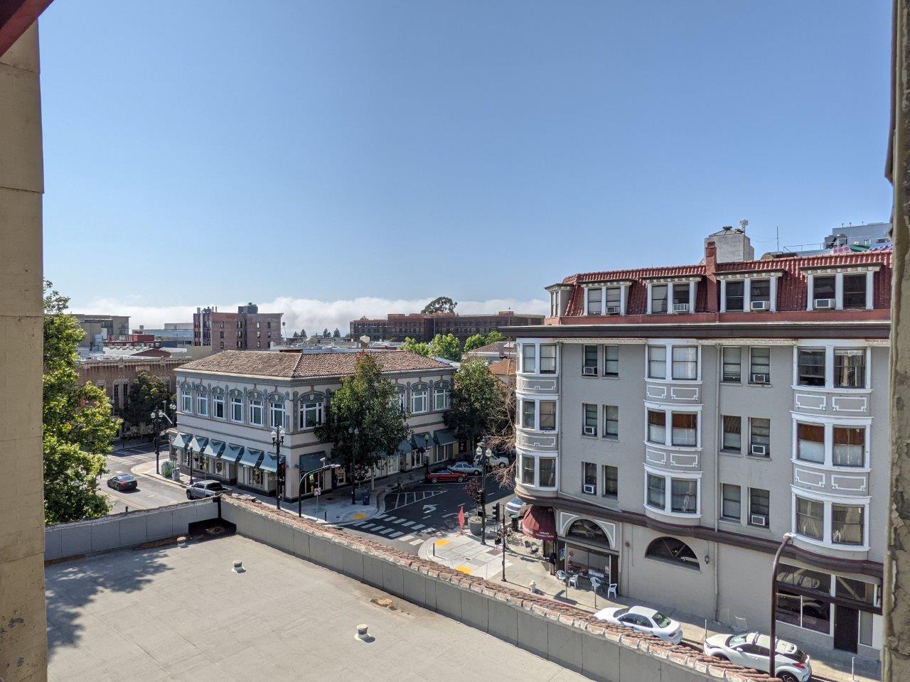 Apt #507 is a top floor end / corner unit with lots of natural light and air. Main living room / kitchen area has a large window that faces East and looks out towards the main UC Berkeley campus and with partial views of the Berkeley Hills.
