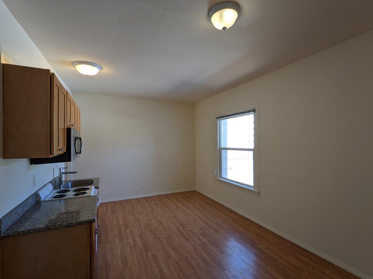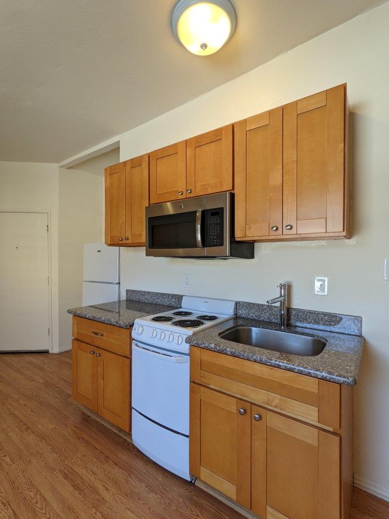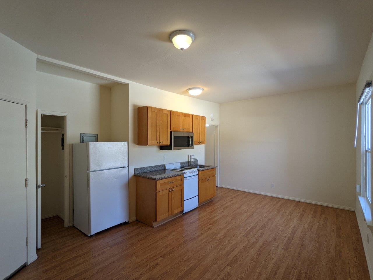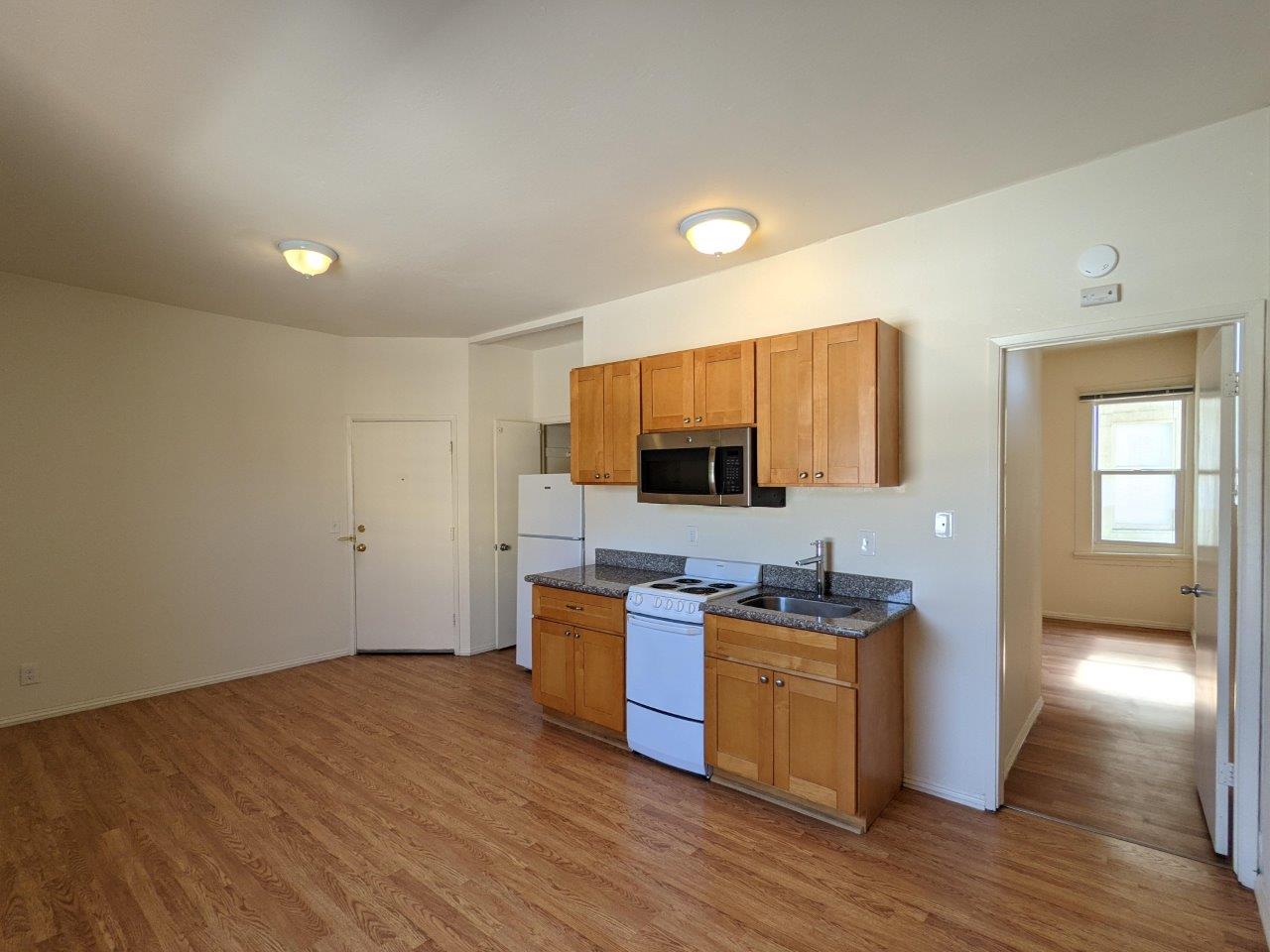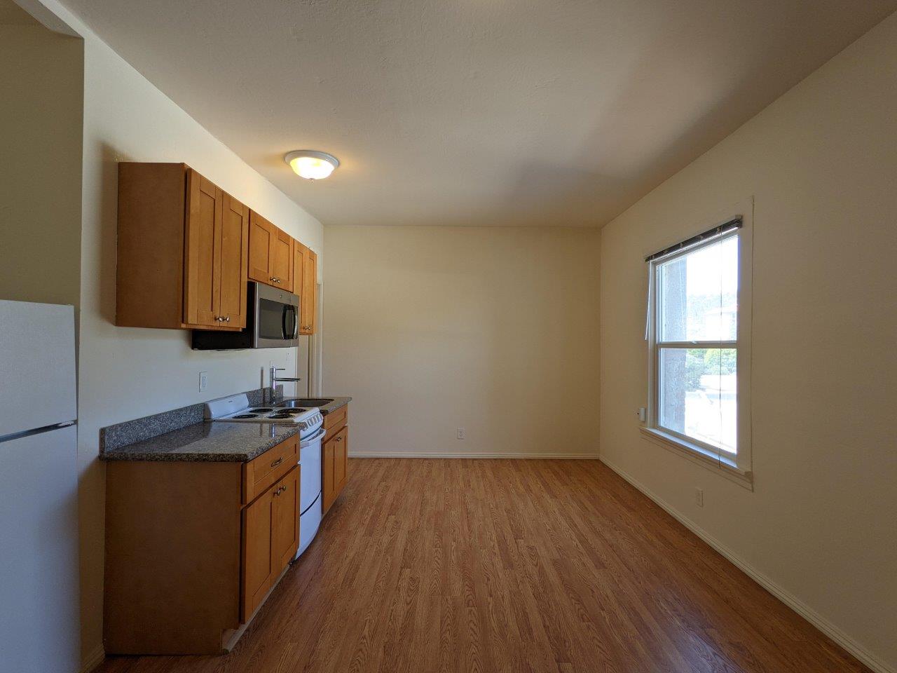 Apt #507 is a top floor end / corner unit with lots of natural light and air. Main living room / kitchen area has a large window that faces East and looks out towards the main UC Berkeley campus and with partial views of the Berkeley Hills.