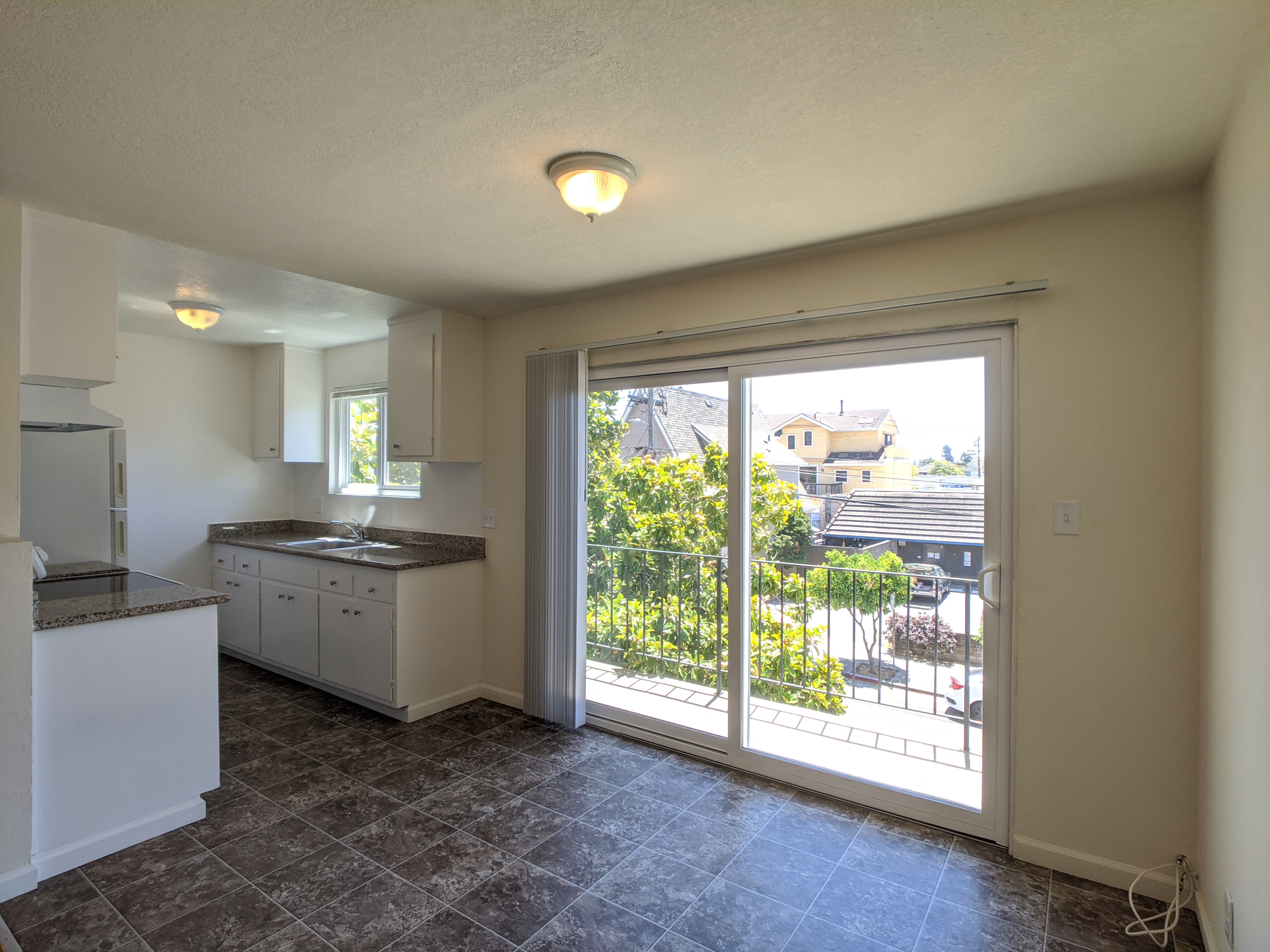 This spacious and sunny corner unit features an open living room that opens out to a covered private patio with views of the surrounding neighborhood.