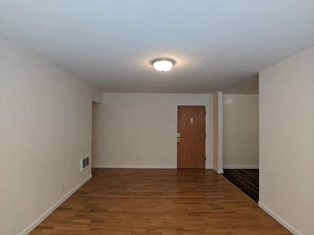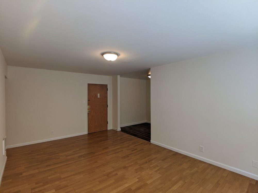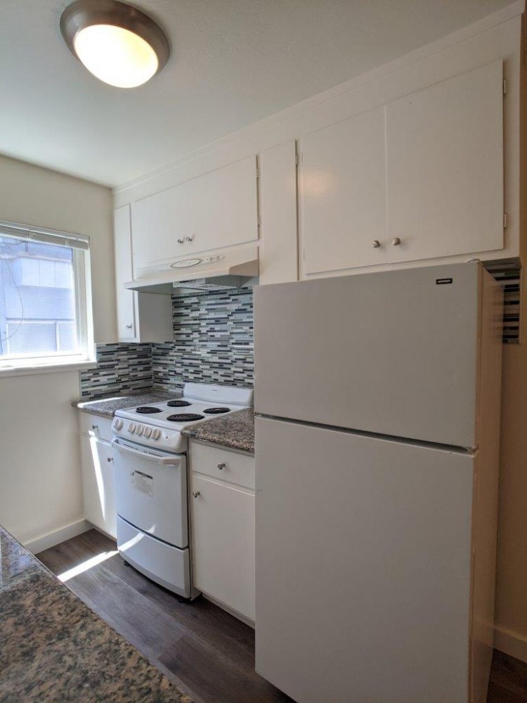 This middle floor unit features a large open layout living room with a wide wall to wall window that nearly covers the entire room. Main living space has natural hardwood flooring installed. Separate kitchen area has included appliances (fridge + electric range) with lots of upper and lower cabinets installed plus a separate eat-in dining area to accommodate a table + chairs.