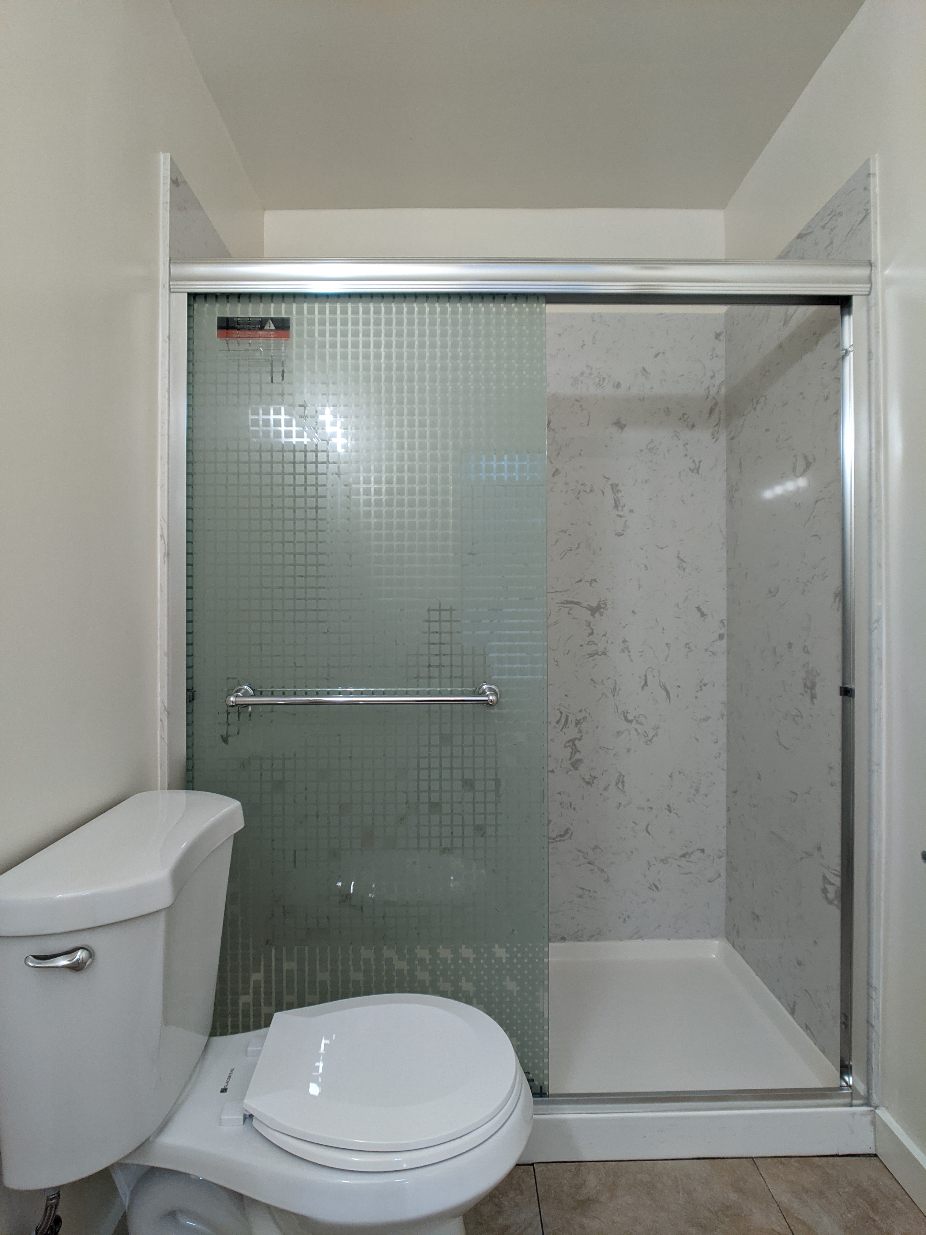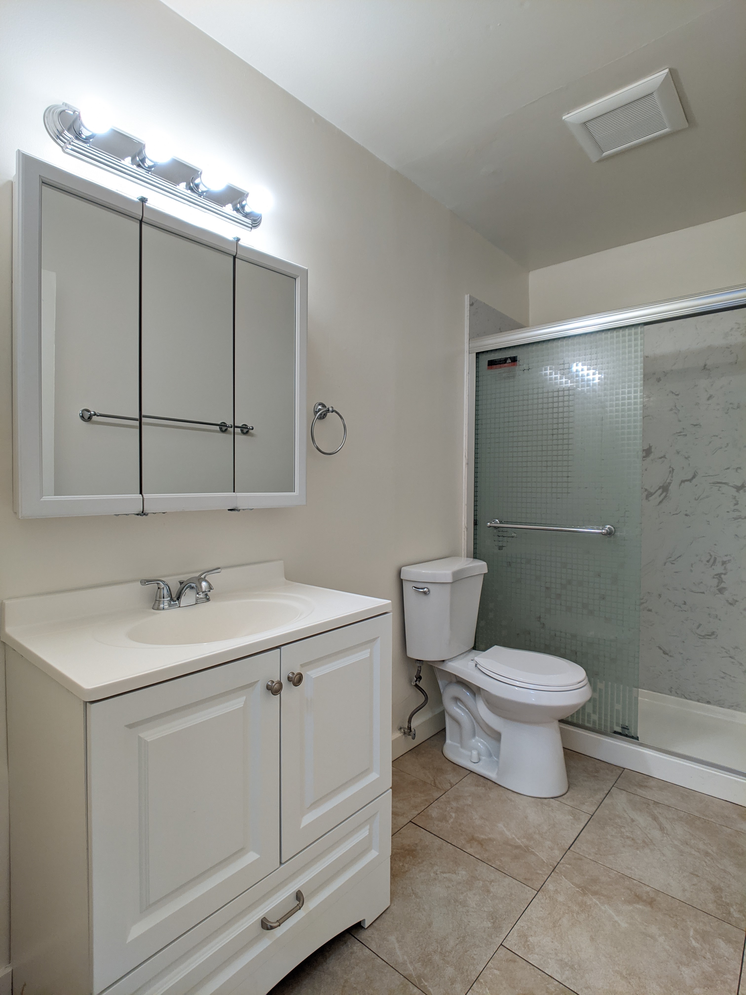 Bathroom was also previously renovated to a walk-in shower with cultured marble surround, glass shower doors, and all new fixtures.